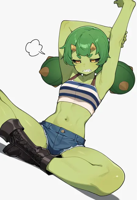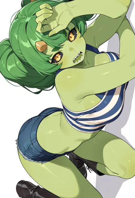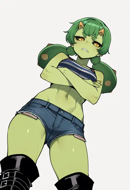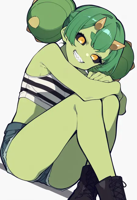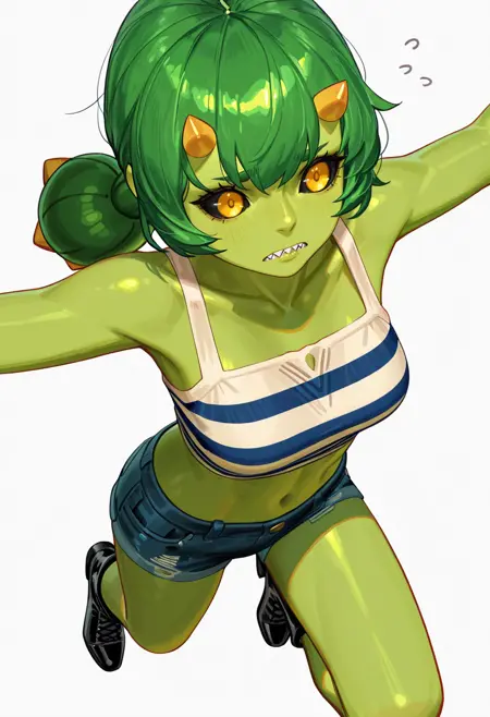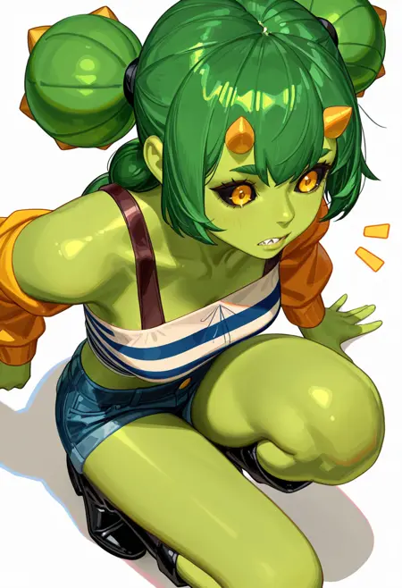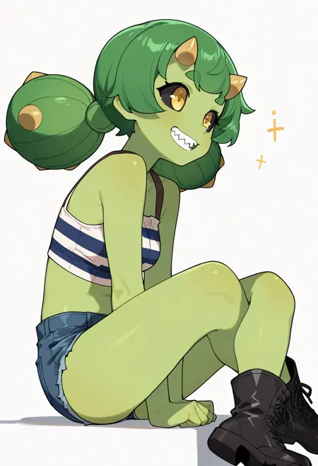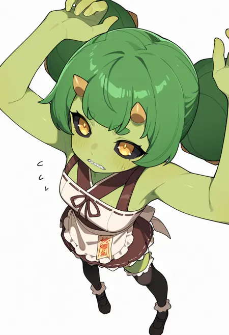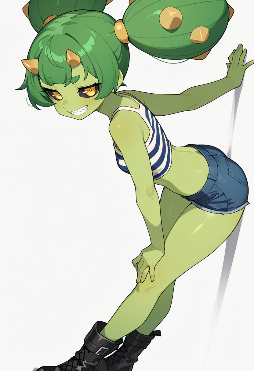 cactus_cnr, 1girl,monster girl, green skin, colored skin, long hair, twintails, bangs, yellow eyes, colored sclera, black sclera, sharp teeth,thick eyebrows, horns, hair ornament,