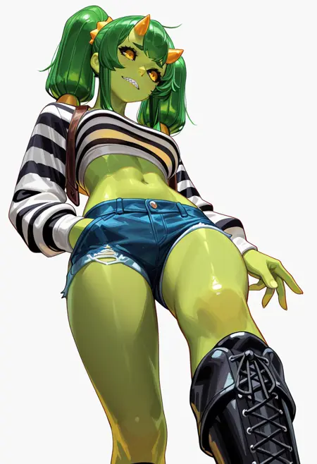 条纹上衣, 露脐装, 牛仔短裤, 短裤, 黑色靴子,