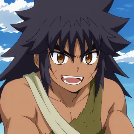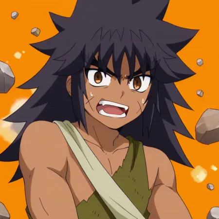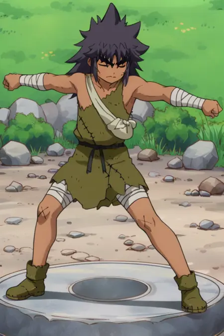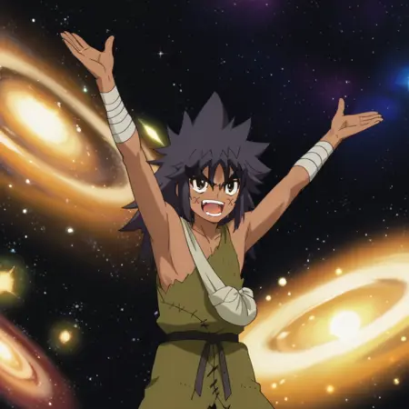 提示:男性,深色皮肤,黑发,尖刺发型,长发,棕色眼睛,浓眉,脸颊有疤痕,洞穴人服饰,破烂衣物,无袖,背包,手臂裹绷带,腰带,腿部裹绷带,膝盖有疤痕,绿色鞋履,户外(天空/云朵/草地/河流/岩石/灌木/远处的建筑/山脉),太空/螺旋星系,橙色背景/坠落的岩石