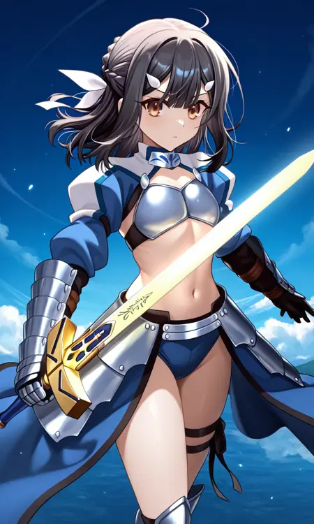 미유 에델펠트 (Fate/kaleid liner Prisma Illya), 중간 길이 머리, 검은 머리, 헤어클립, 머리 장식, 검은 머리, 복부, 리본, 머리 리본, 땋은 머리, 갈색 눈, 가슴, 작은 가슴, 허벅지, miyu saber, pendragonarmor, 겐틀렛, 칼, excalibur (Fate/stay night), 갑옷