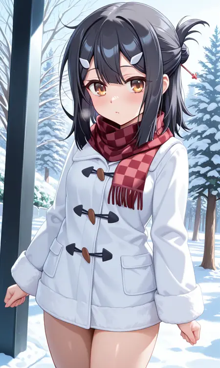 미유 에델펠트 (Fate/kaleid liner Prisma Illya), 검은 머리, 중간 길이 머리, 갈색 눈, 헤어핀, 가슴, 작은 가슴, 허벅지, 겨울복, 흰 코트, 스웨터, 체크 무늬 스카프