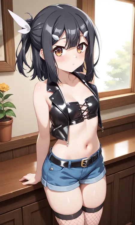 미유 에델펠트 (Fate/kaleid liner Prisma Illya), 검은 머리, 중간 길이 머리, 갈색 눈, 헤어핀, 가슴, 작은 가슴, 허벅지, 튜브 탑, 가죽 조끼, 파란 반바지, 피시넷 허벅지 양말