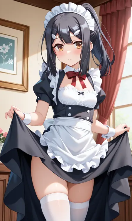 미유 에델펠트 (Fate/kaleid liner Prisma Illya), 검은 머리, 긴 머리, 포니테일, 흐르는 앞머리, 사이드락, 갈색 눈, 가슴, 작은 가슴, 허벅지, MiyuMaid, MMaid_hairclips, MMaid_maid_apron, MMaid_maid_headdress, MMaid_dress, MMaid_bowtie, MMaid_thighhhighs, 긴 드레스