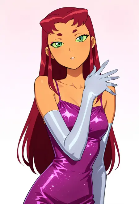뾰족한 밝은 분홍색 머리, 긴 속눈썹을 가진 큰 녹색 눈, 목에 털장식이 있는 짧은 보라색 재킷, 긴 소매와 매치된 보라색 장갑, 벨트가 있는 보라색 미니스커트, 분홍색 벨트, 검은색 찢어진 반투명 타이츠, 높은 분홍색 부츠, 생동감 있는 색상, 카트oons 아트 스타일,