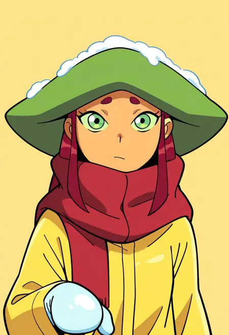 해브아웃핏, 보라색 허벅지 부츠, 녹색 넓은 모자, 노랑색 레인코트, 밝은 파란색 스노우 장갑, 빨간 스카프,