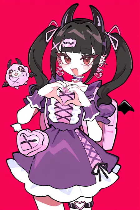| トレーニングワード | reml, jirai kei, twintails, long hair, black hair, bangs, blunt bangs, hair ornament, x hair ornament, hairband, black hairband, horns, fake horns, demon horns, hair ribbon, pink ribbon, jewelry, piercing, earrings, ear piercing, heart earrings, pink nails, choker, purple choker, frills, frilled choker, collarbone, short sleeves, puffy sleeves, puffy short sleeves, frilled sleeves, dress, purple dress, center frills, center cross lace, cross-laced dress, layered dress, multicolored dress, wrist cuffs, frilled wrist cuffs, purple wrist cuffs, pink trim, white trim, backpack, bag, pink bag, winged bag, wings, fake wings, o-ring thigh strap, heart o-ring, creature, stuffed animal, pomemori, frilled socks, kneehighs, white socks, high heels, platform shoes, purple shoes, cross-laced shoes コピーしました! |