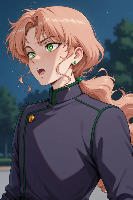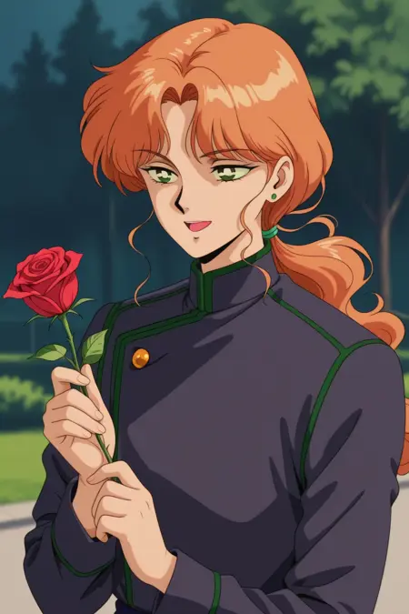 masterpiece , best quality , amazing quality , zoisite , zoimainoutfit , zoisite hair , solo , upper body , 1boy , male focus , ponytail , green eyes , open mouth , long hair , gakuran , low ponytail , earrings , at park , impressionism , high detail , depth of field , holding , rose , smile happy , orange hair , retro artstyle