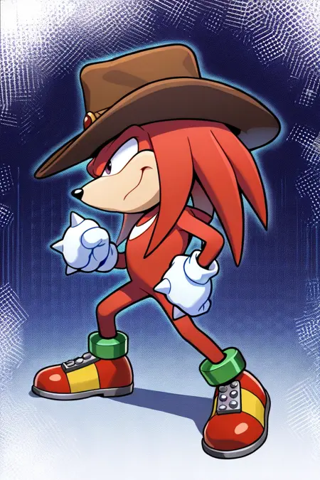 KnucklesOVA, 1boy, red fur, long red dreadlocks, white gloves, spiked knuckles, red shoes, sonic the hedgehog, black eyes, short, knuckles the echidna, brown cowboy hat