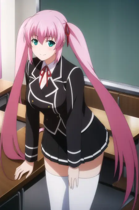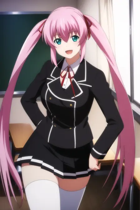 outfit_1, 검정 재킷, 더블버튼, 와인그 컬러, 분홍 넥리본, 흰 셔츠, 검정 치마, 주름치마, 흰 허벅지양말, 젯타이 르오이키, 로퍼, 흰 신발,