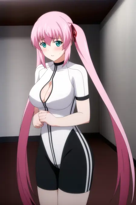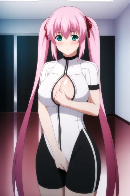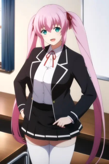 <lora:MiuOusawa-v3-08:0.7>, ChopioMiuOusawa, 분홍색 머리카락, 긴 머리, 매우 긴 머리, 트윈테일, 빨간 머리 리본, 눈 사이의 머리카락, 아쿠아 눈, (시청자 바라보기:1.3),