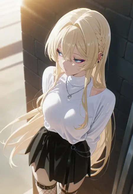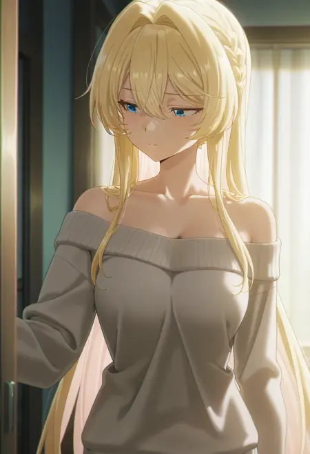 外貌标签: 1girl, solo, 中等胸部, 蓝眼睛, 金发, 头发遮住眼睛, 非常长的头发, 侧发, 发丝垂落, 法式编发,