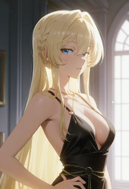 外見のタグ: 1girl, solo, 中程度の胸, 青い目, 金髪, 目の間の髪, 非常に長い髪, 横髪, 髪の巻き取り, フレンチブレード,