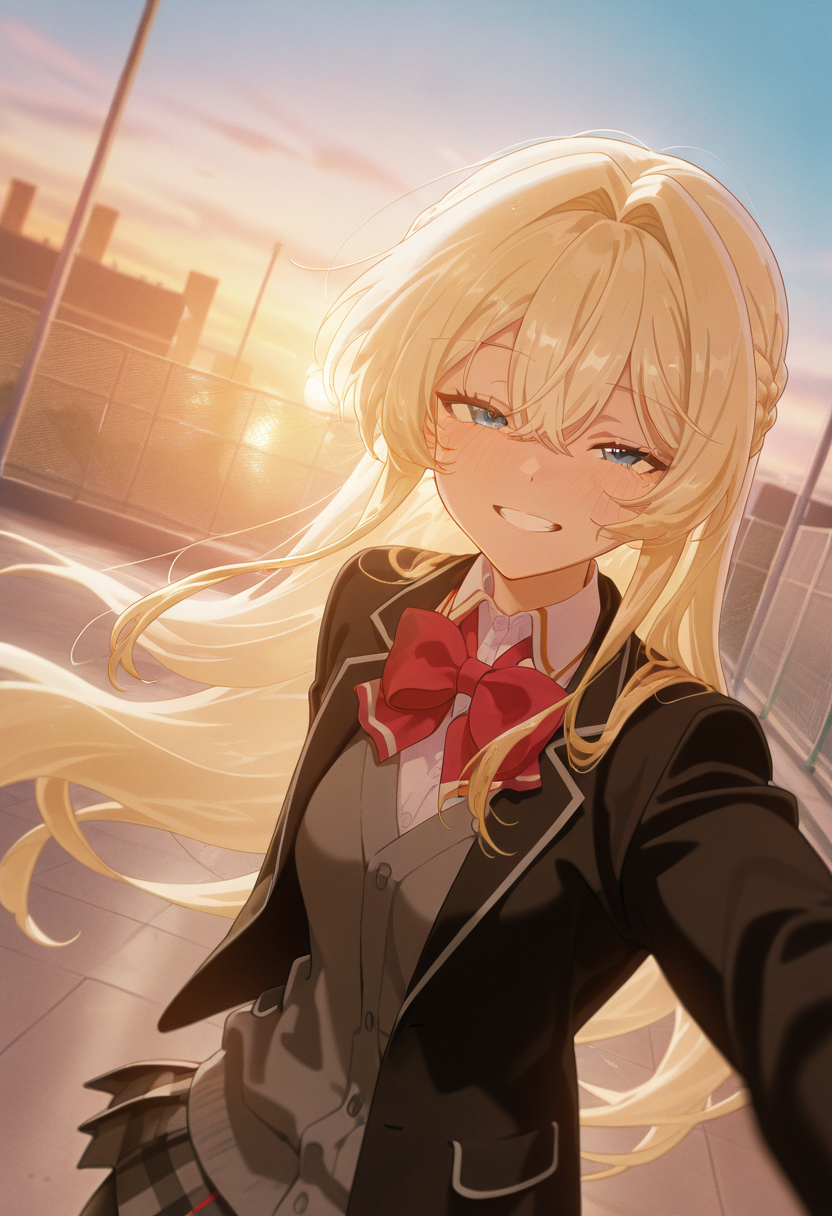 服装标签: 长袖, 黑色夹克, 校服, 白色衬衫, 百褶裙, 花边, 黑色夹克, 黑色连裤袜, 格子裙, 灰色针织开衫, 红色蝴蝶结领结, 有领衬衫,