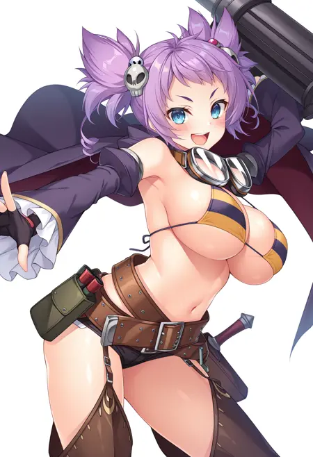 - 縞模様のビキニ, 黄色のビキニ, ビキニトップのみ, アンダーブーブ, 首に巻いたゴーグル, 交差するベルト, ルーズなベルト, ベルトスカート, マイクロショーツ, 外れた袖, フリル付き袖, フィンガーレスグローブ, ケープ, ガーターストラップ, チャップス,