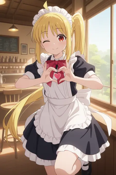 aanijika, 红眼, 金发, 侧马尾, 辫子, 天线辫, nijikaband, 红色蝴蝶结, 黑色衬衫, 短袖, 衣服上有文字, 背带, 棕色长裤, 格子长裤, 动漫上色,
