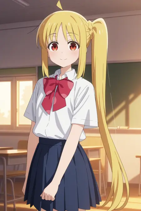 aanijika, 红眼, 金发, 侧马尾, 辫子, 天线辫, nijikaschool, 白色衬衫, 短袖, 衬衫塞入裤中, 红色蝴蝶结, 蓝色裙子, 百褶裙, 动漫上色,
