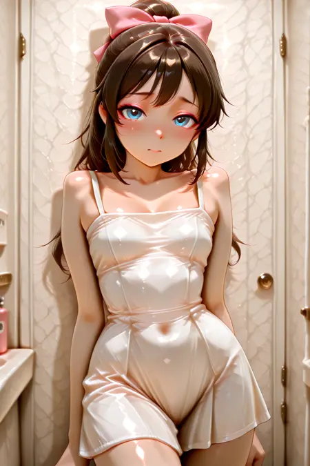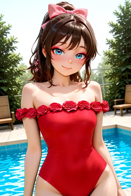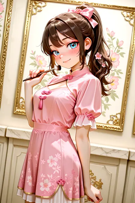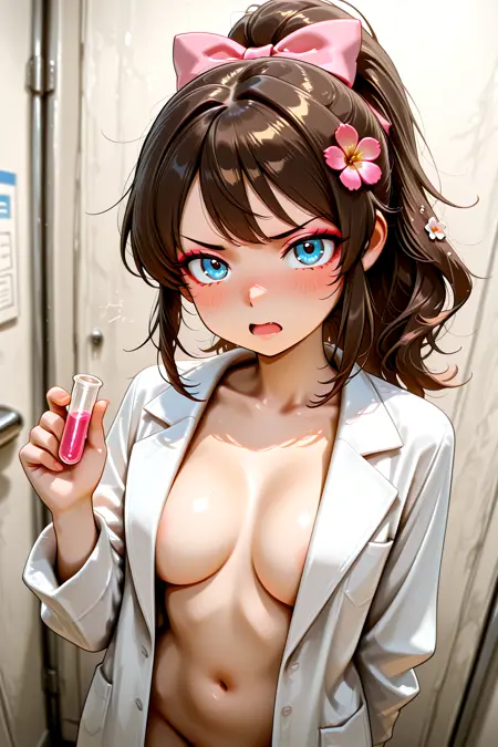 Hanasaki_Himari_OC, long hair, blue eyes, brown hair, high ponytail, hair intakes, hair bow, pink bow, hair flower, pink flower, hair ornament, sidelocks, breasts