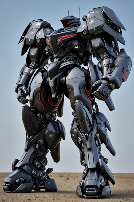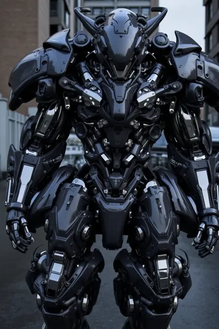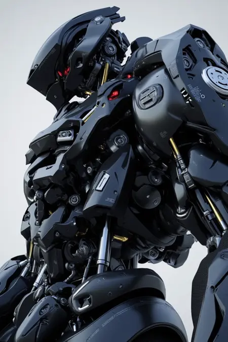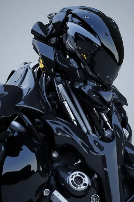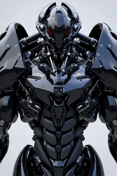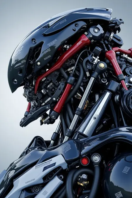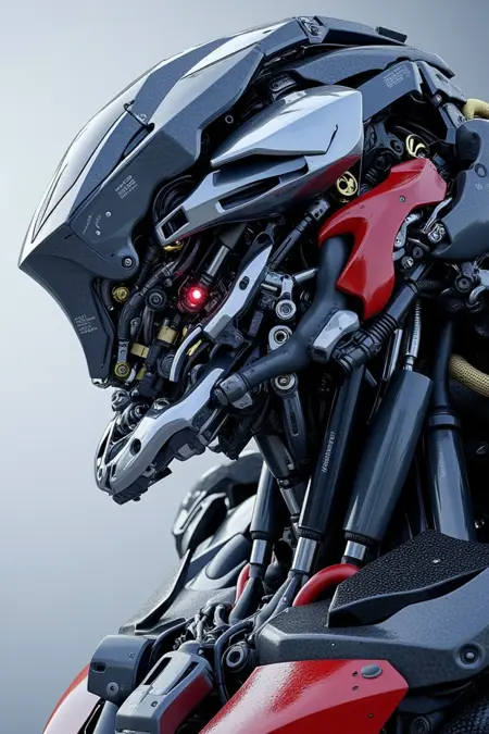 Intricately designed robotic figures in organic plates and notable composition of numerous pistons