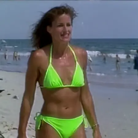 A woman wearing a neon green bikini on a Florida beach in 1991 during Spring Break, Home Video camcorder Footage from the 1990s. VHS90s