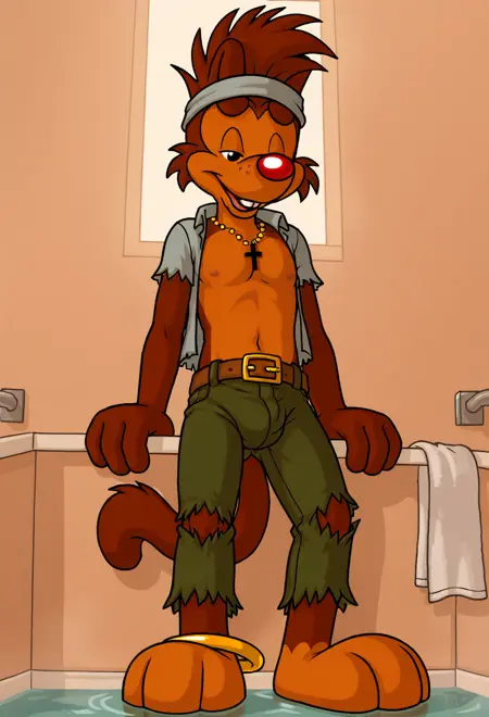 lora:Ricky-Santos-illustrious:0.7, rickysantos, gold anklet, toe ring, male focus, grey headband, brown hair, jewelry, tail, furry, full body, necklace, cross, buck teeth, brown belt, grey open shirt, torn clothes, green torn pants
