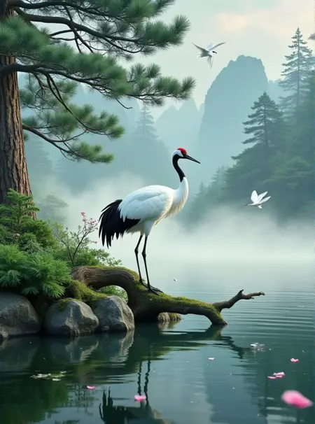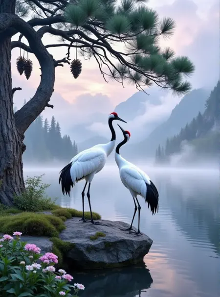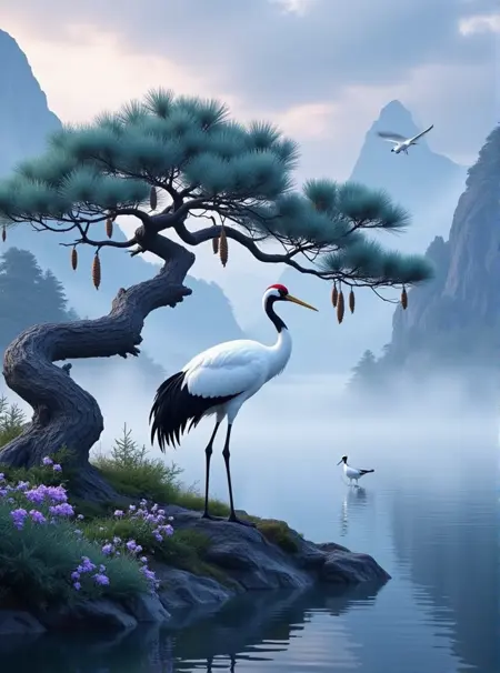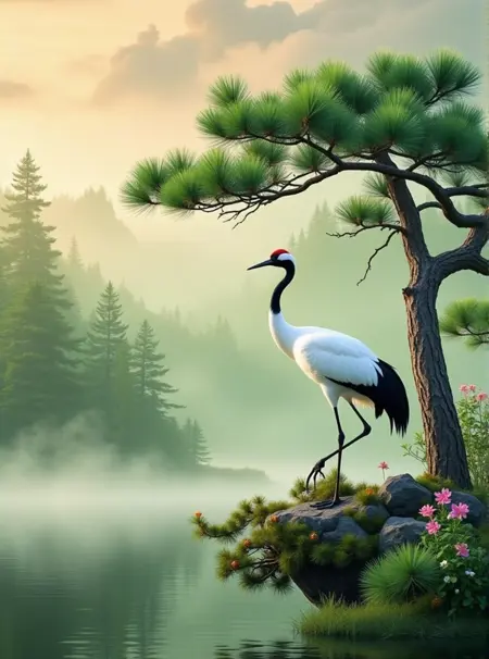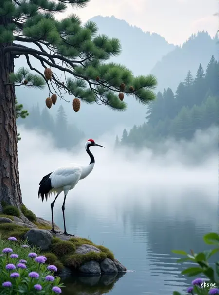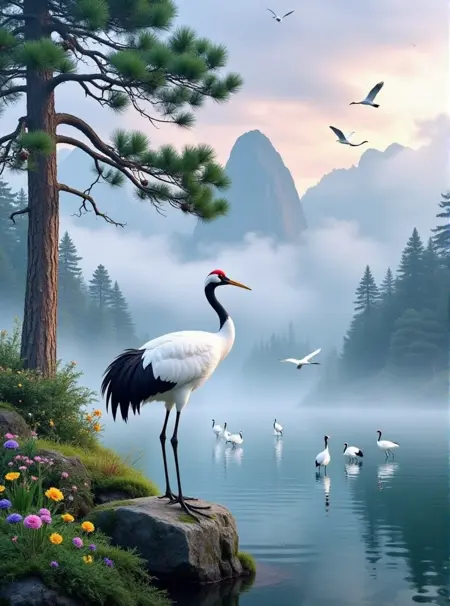 自然景观中的松树与丹顶鹤,湖面云雾缭绕,野花绽放,远山朦胧,营造出宁静如中国水墨画般的场景。