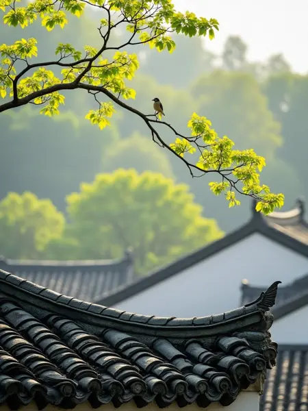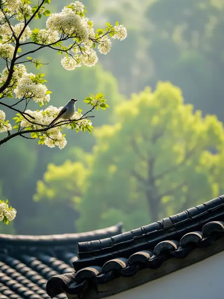 木と鳥を伴う中国伝統建築、木に白い花が咲き、鳥が鳴き、暖かい日差しが瓦屋根に優しい影を落としている。