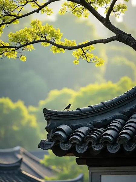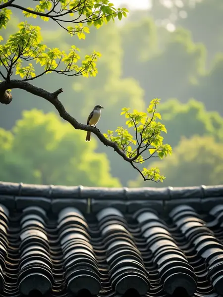 木と鳥を伴う中国伝統建築、濃い緑の葉が屋根の一部を覆い、鳥がそっと顔をのぞかせる、隠れんぼのような興味深い光景。