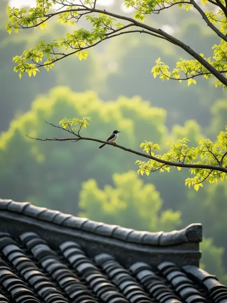 木と鳥を伴う中国伝統建築、もやに包まれた背景がぼんやりと霞み、豊かな緑が広がり、鳥が静かな建築の風景に生き生きとした動きを加える。