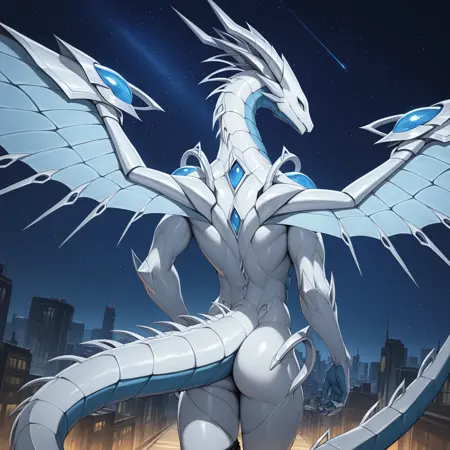 トリガー句:blue-eyes_abyss_dragon, dragon, dragon tail, dragon wings, furry, hip handles, duel monster, white scales, blue chest