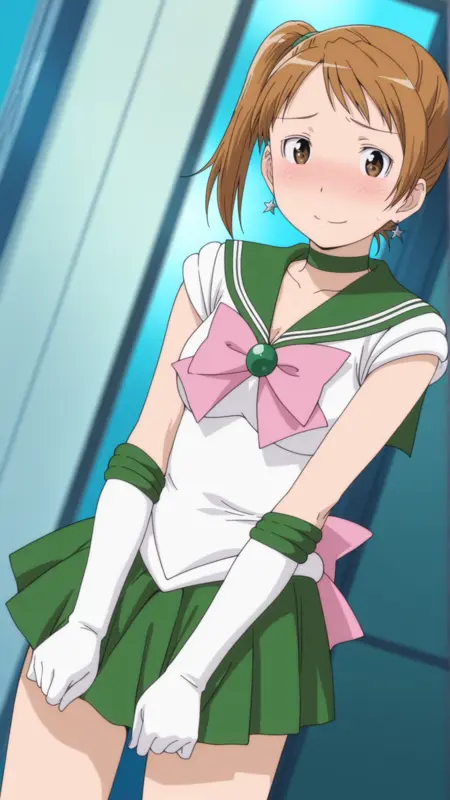 外見: 茶色の目、茶色の髪、サイドポニー、