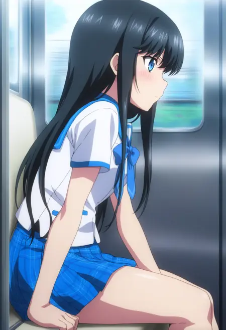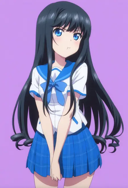 의상: 학교 유니폼, 파란 해적 칼라, 흰 셔츠, 짧은 소매, 파란 리본넥타이, 파란 치마, 체크무늬 치마, 주름 치마,