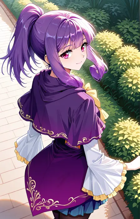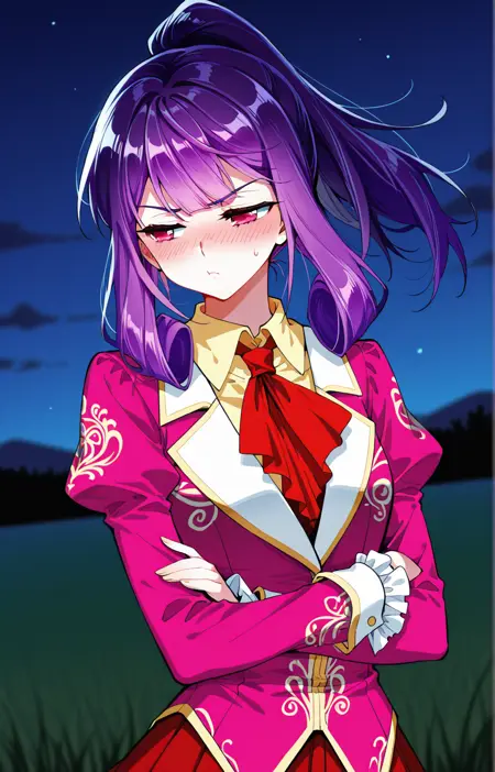 | トレーニングワード | Jiujiu, magenta eyes, long hair, purple hair, high ponytail, long sidelocks, long bangs,コピーしました! Jiujiu_outfit1, purple capelet with yellow lining, large yellow bow, purple jacket, puffed short sleeves, golden embroidery, white shirt with wide sleeves, blue inner cuffs, large yellow bow, blue skirt with yellow hem, thigh-high black stockings, white sleeves, purple bootsコピーしました! Jiujiu_outfit2, white dress, gold trim, blue accents, high collar, pauldrons, detached sleeves, blue arm warmers, gemstone accents, thigh-high slit dress, dual hip-plate belt, blue belt, gold-trim belt, red gem belt, black thigh-high stockings, white high heels,コピーしました! Jiujiu_outfit3, magenta blazer, gold trim, ornate swirl pattern, fitted jacket, yellow inner shirt, pointed collar, red ribbon tie, white frilled cuffs, red pleated skirt,コピーしました! |