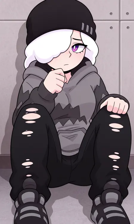 Ruby,1girl, white hair, black torn pants, pants, hoodie, hood, purple eyes, hair over one eye,black beanie, black pants, shoes, grey and black hoodie, long sleeves,hood down