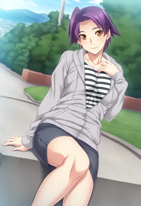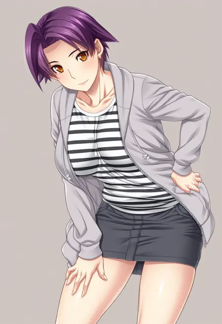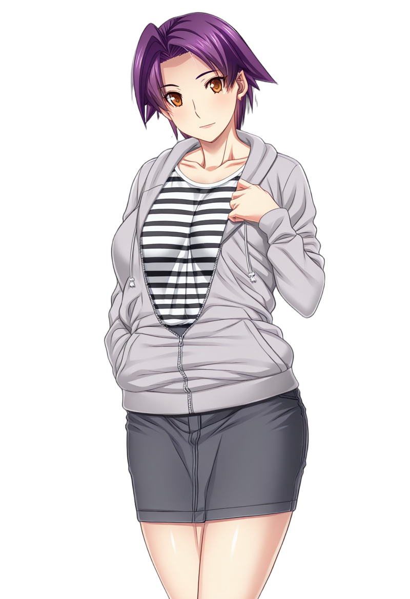 衣装: ストライプシャツ、グレーフーディー、ロングスリーブ、デニムスカート