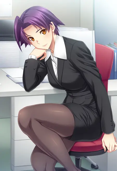衣装: ボタンシャツ、ブラックジャケット、ロングスリーブ、ミニスカート、ブラックスカート、ブラックパンスト