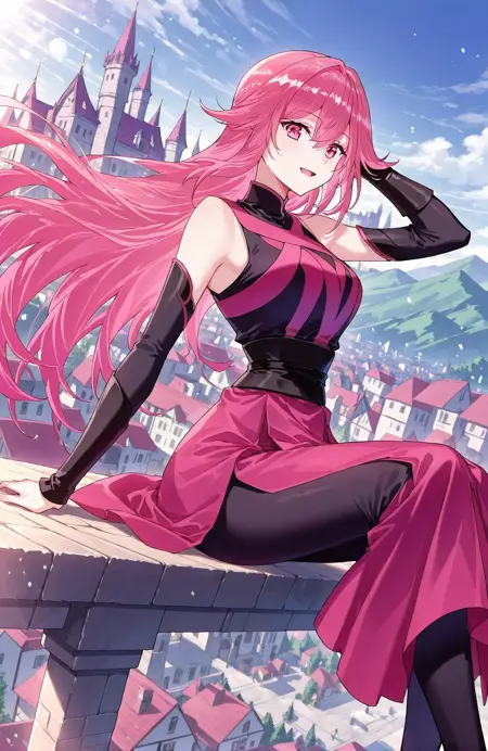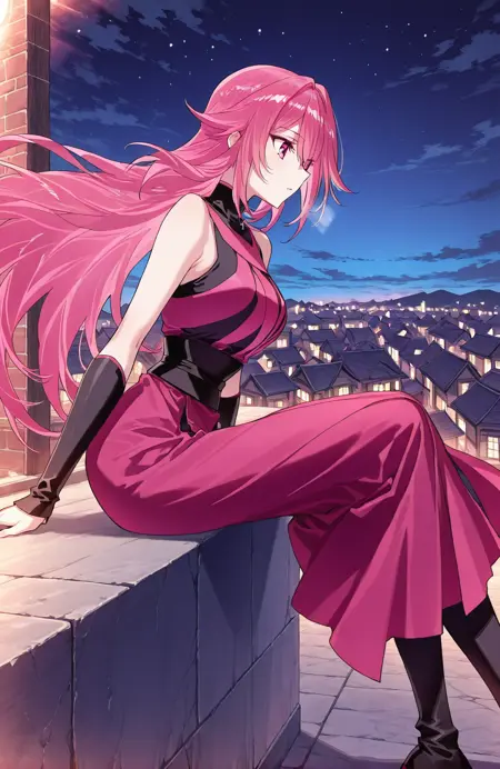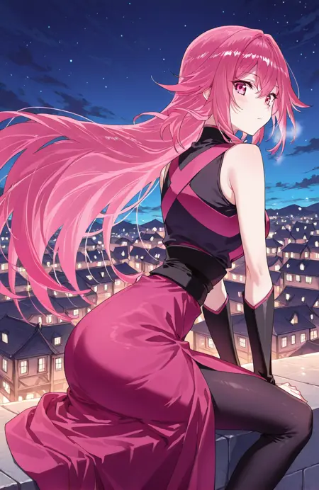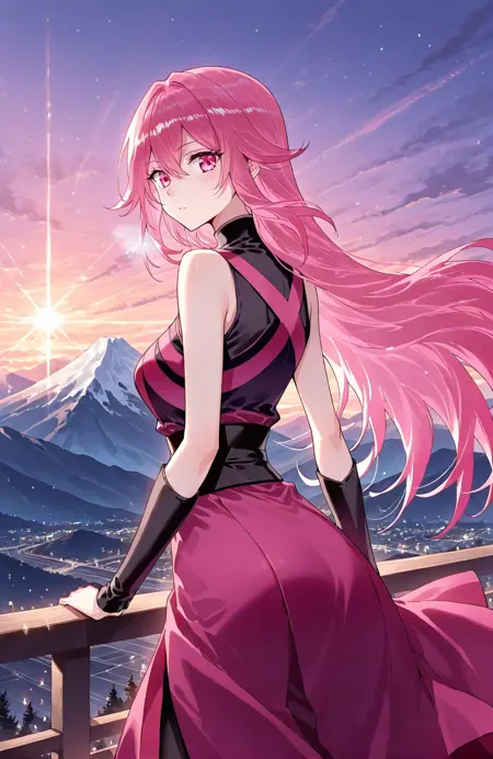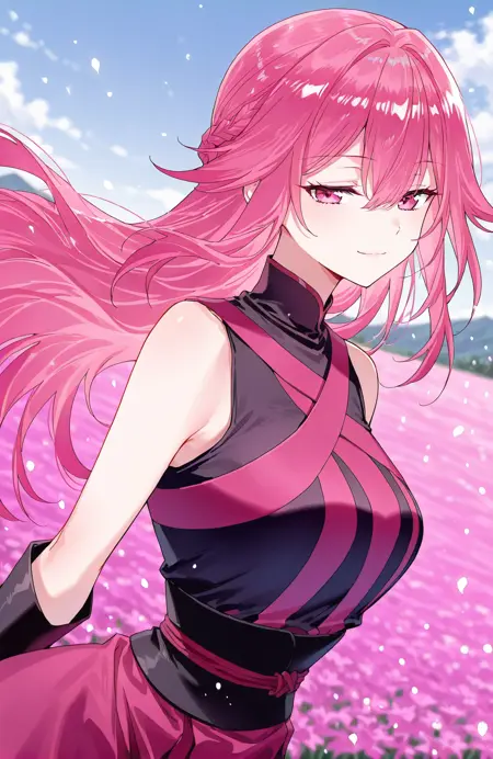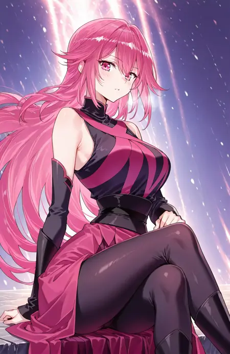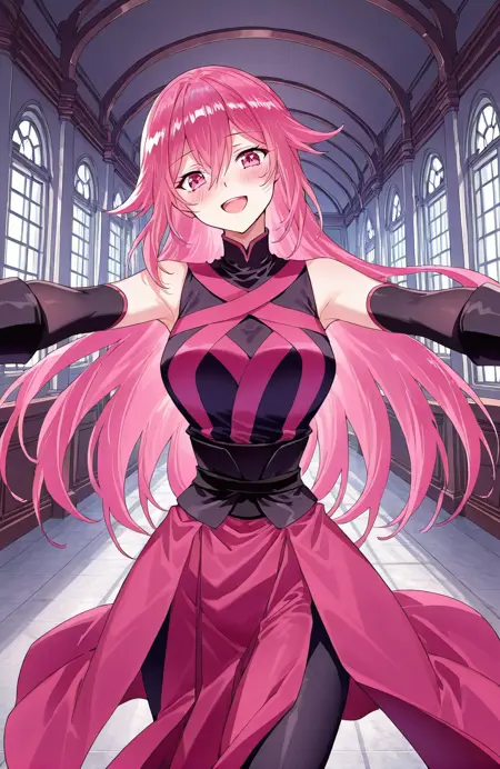 Qing, 1girl, solo, long hair, layered hair, pink hair, gradient hair, long bangs, hair between eye, sharp hair tips, pink eyes,