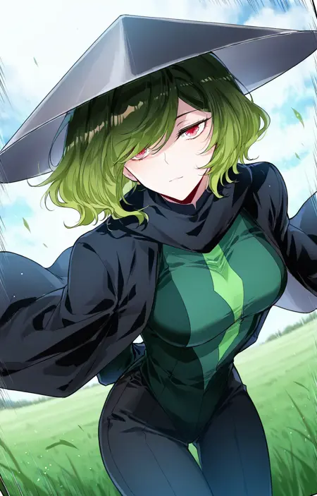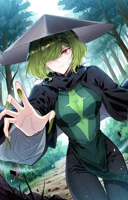 Gaiyin, 1girl, solo, medium hair, wavy hair, green hair, gradient hair, hair covering one eye, side-swept bangs, red eyes, wide-brim hat,
