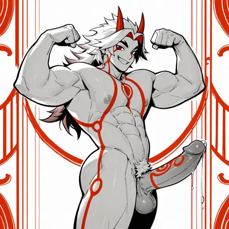 <lora:ITTO:1> itto, 角, 男性焦点, 鬼, 长发, 白发, 身体彩绘, 肌肉发达, 肌肉男性, 红角, 身体纹饰, 胸肌, 腹肌, bara, 1个男孩, 红眼, 乳头, 纹身, 面部彩绘, 饰品, 大胸肌, 浓眉, 单人, 微笑