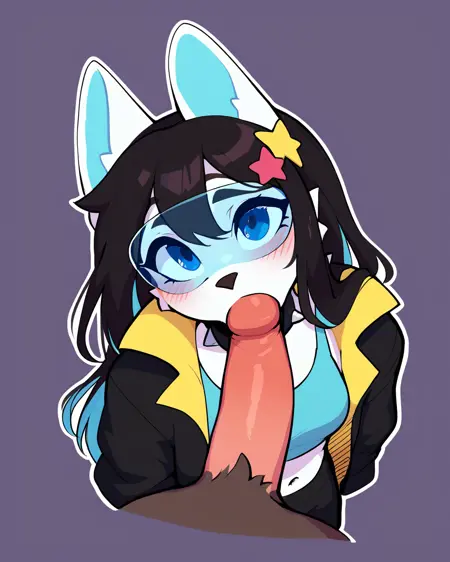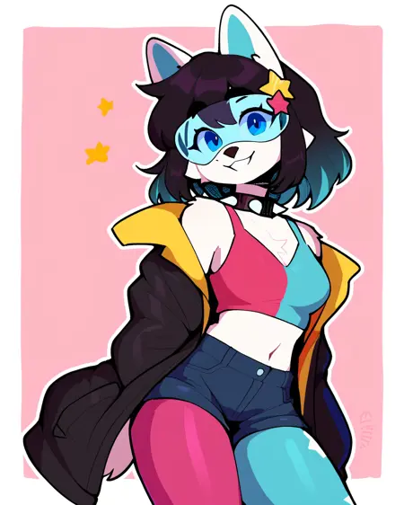 Triggers: furry, female, fox, black hair, blue eyes, multicolored hair, medium breasts, hair ornament, pantyhose, midriff, navel, visor, jacket, shorts, open jacket, bangs, star hair ornament, spiked collar