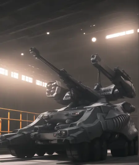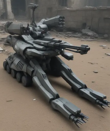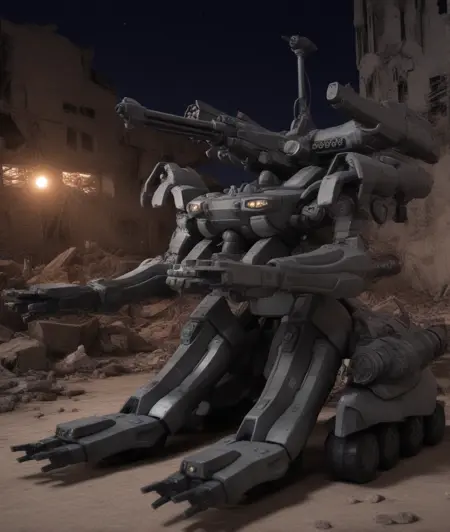 GUNHEADst, robot, mecha, (outdoor, night, ruins),from below,dynamic angle,multi legs,