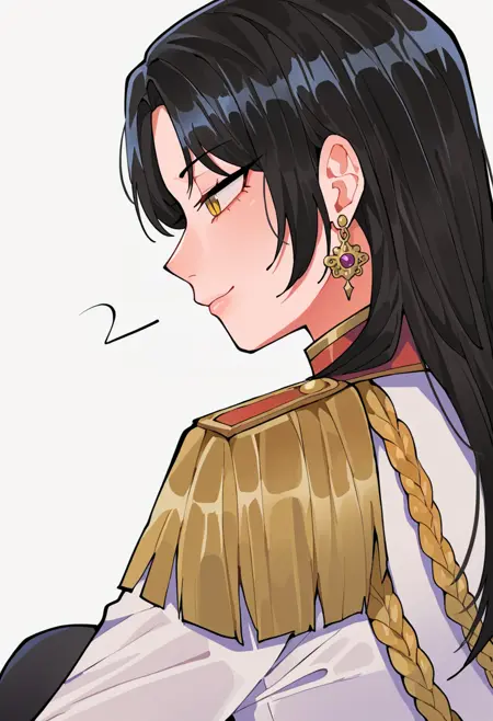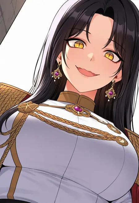 esteban_cnr,1girl, black hair, long hair, yellow eyes, slit pupils, jewelry, earrings, parted bangs,