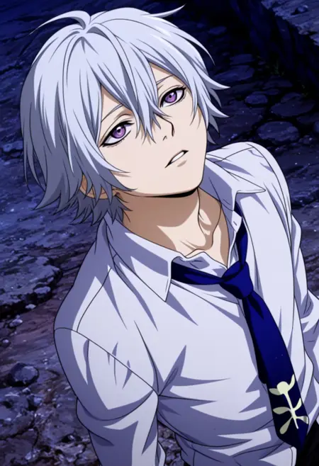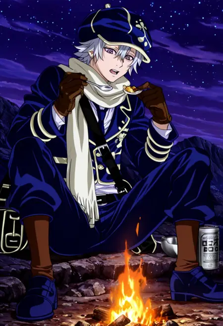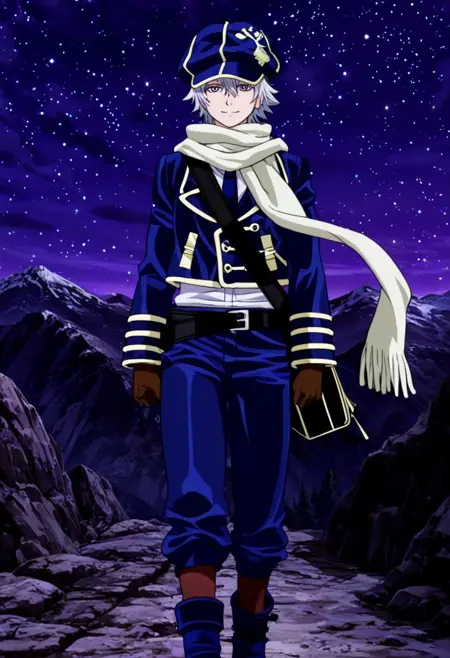 | トレーニングワード | Gauche Suede, white-gray hair, purple eyes, blue beret hat with yellow bee design, long white scarf, blue blazer, yellow accents, white collared undershirt, blue necktie, brown gloves, black belt, blue pants, brown socks, dark blue boots, black sling bag, gunコピーしました! |