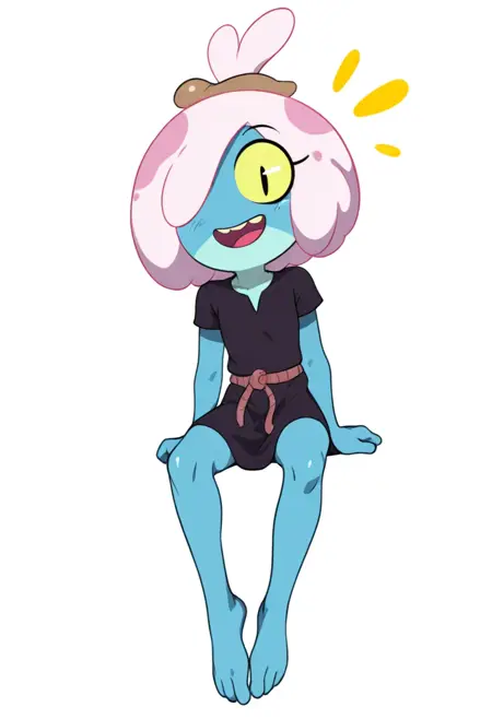 青い肌、トップノット、片目に髪をかけた、黄色い sclera、黒いドレス