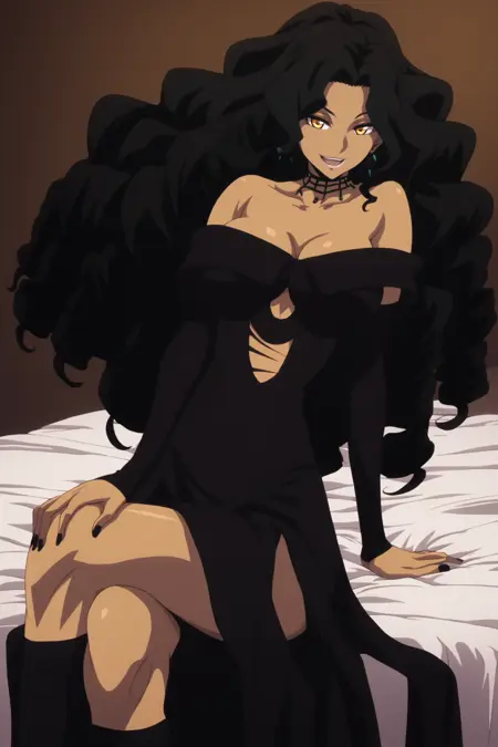 | Trained Words | Yanna, 1girl, solo, large breasts, yellow eyes, long hair, black hair, drill hair, curly hair, dark-skinned female, dark skinCopied! cleavage, dress, jewelry, bare shoulders, earrings, makeup, nail polish, black nails, lipstick, choker,Copied! |