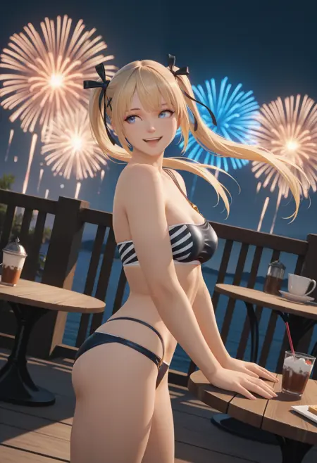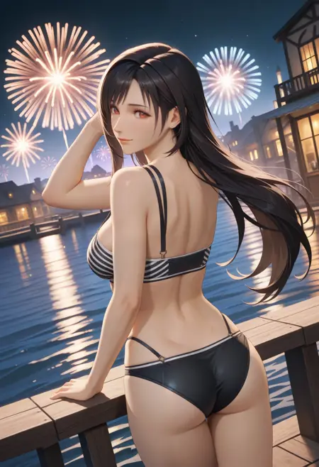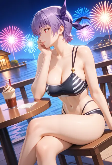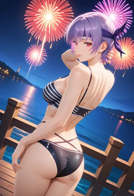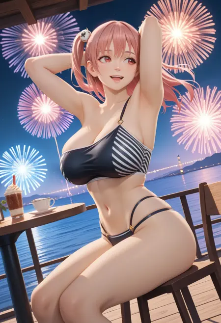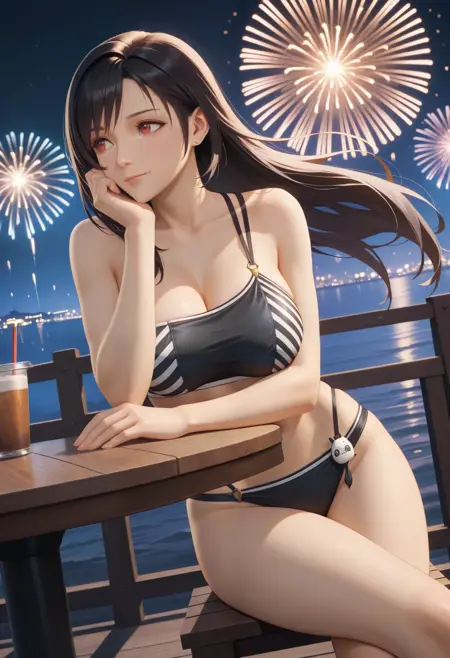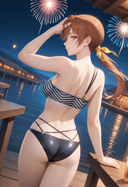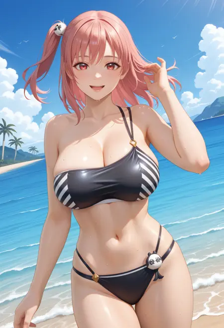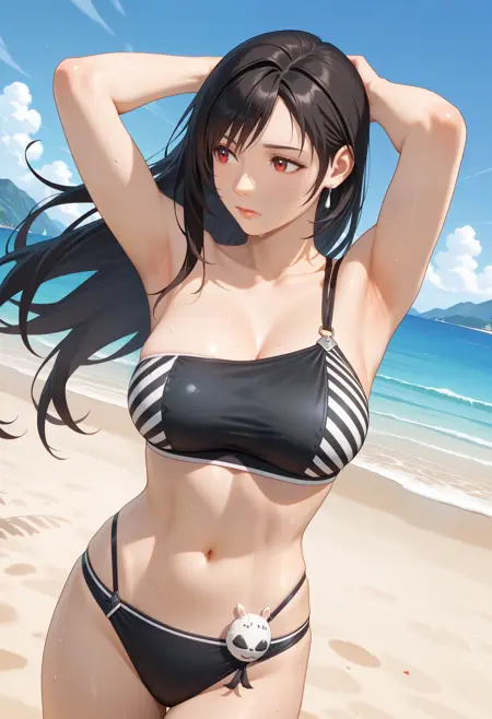 基本プロンプト: "AtelierYumiaBikini_Doaxvv,black bikini,one shoulder strap,multi-strapped bikini,two-line strap,striped bikini top,striped crop top".
