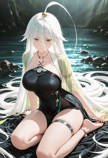 murongyuzhuo, 1girl,solo, barefoot, white hair, black dress, very long hair, large breasts,anklet, jewelry, hair ornament,choker,jingle bell,absurdly long hair, thigh strap, hair between eyes, green eyes, see-through, necklace