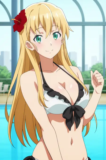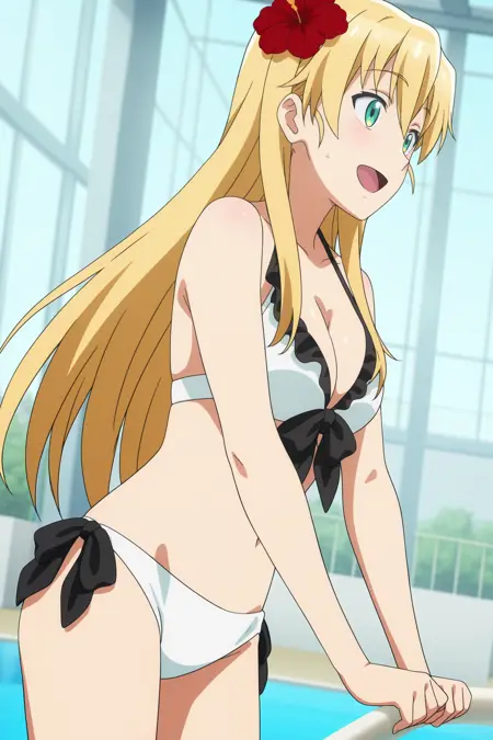 tendou karen, long hair, blonde hair, hair flower, red flower, choppy bangs, green eyes, white bikini, black strap, frilled bikini, ribbon-trimmed bikini, side-tie bikini bottom