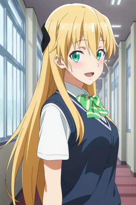 tendou karen, long hair, blonde hair, hair ribbon, black ribbon, choppy bangs, green eyes, short sleeves, white shirt, collared shirt, green bowtie, striped bowtie, blue sweater vest, untucked shirt, grey skirt, pleated skirt, black socks, kneehighs, brown footwear, loafers