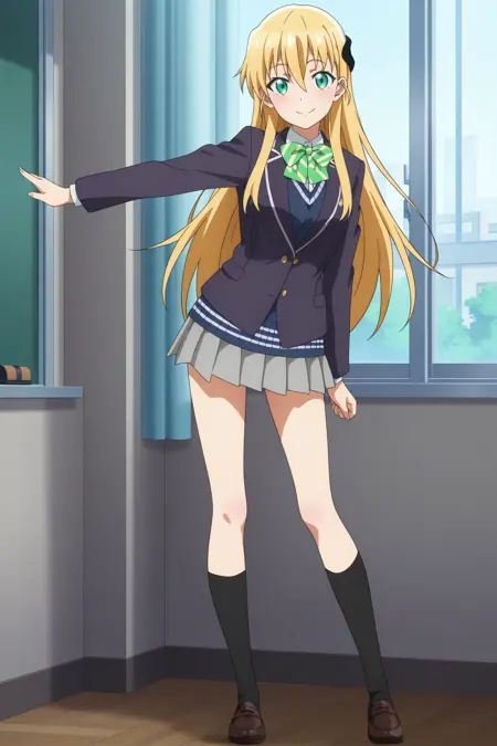tendou karen, long hair, blonde hair, hair ribbon, black ribbon, choppy bangs, green eyes, long sleeves, black jacket, white shirt, collared shirt, green bowtie, striped bowtie, blue sweater vest, untucked shirt, grey skirt, pleated skirt, black socks, kneehighs, brown footwear, loafers