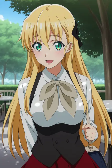 tendou karen, long hair, blonde hair, hair ribbon, black ribbon, choppy bangs, green eyes, long sleeves, white shirt, collared shirt, black vest, underbust, grey neckerchief, shoulder bag, red skirt, miniskirt, black pantyhose, grey footwear, strappy heels